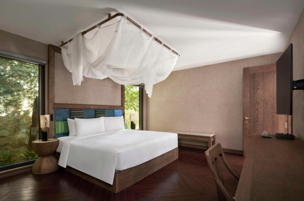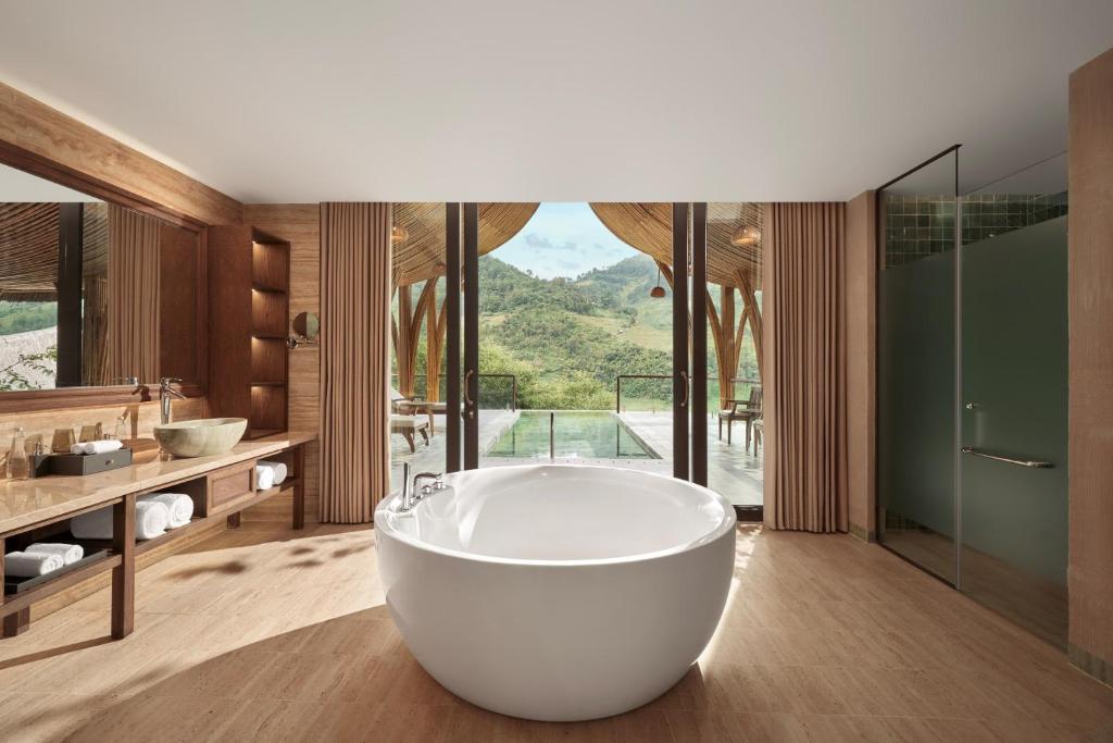 Tiện nghi phòng: giường cỡ lớn, phòng khách riêng, minibar, máy pha cà phê, phòng tắm lát đá, bồn tắm lớn view núi rừng